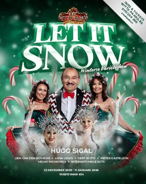 Met ‘Let It Snow’ opent Het Witte Paard zijn deuren voor een winterse zoektocht naar geluk. In de show probeert Hugo om Koning Winter te overtuigen om het te laten sneeuwen en haalt daarvoor alles uit de kast. En welke rol spelen Sinterklaas, de Kerstman en een sexy kerstelfje in het geheel? De prachtige Vegas Showdancers in sprookjesachtige kostuums zijn erbij, je zingt mee met de mooiste melodieën en lacht je een kriek met onverwachte en komische situaties. Hugo krijgt in de show het gezelschap van een jonge, energieke cast. Met de ‘nachtegaal uit de Kempen’, zangeres Lissa Lewis, staat een artiest met ervaring op het podium. Drie artiesten maken hun debuut in de wintershow: Pieter Casteleyn, Gert Botty en Lien Van den Bossche. Ze tonen hoe veelzijdig ze zijn als artiest in deze unieke kerstshow.