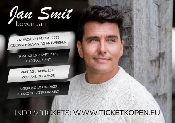 Jan Smit brengt op 28 oktober 2022 het nieuwe album ‘Boven Jan’ uit, gekoppeld aan een theatertournee! De populaire Jan Smit maakte vanuit de Haarlemse vinylfabriek Record Industry de releasedatum van zijn nieuwe album “Boven Jan” bekend via zijn sociale media. Op vrijdag 28 oktober 2022 verschijnt deze gelijktijdig digitaal in de Lage Landen, maar ook op cd en vinyl. In januari 2023 begint in Purmerend zijn nieuwe gelijknamige theatertour, die goed zal zijn voor veel concerten, ook in Vlaanderen. Op 11 maart 2023 geeft Jan zijn theaterconcert “Boven Jan” in Stadsschouwburg, Antwerpen. Na zijn 2de succesvolle doortocht in het Antwerpse Sportpaleis, staat Jan met zijn ‘Boven Jan’-theaterconcert op 11 maart 2023 in Stadsschouwburg Antwerpen. Daarna brengt hij met zijn liveband nieuwe nummers en zijn hits ten gehore in Capitole Gent op 19 maart 2023, Trixxo Theater Hasselt op 10 juni 2023 en Kursaal Oostende op 23 juni 2023. Tickets en informatie vind je op www.ticketkopen.eu.